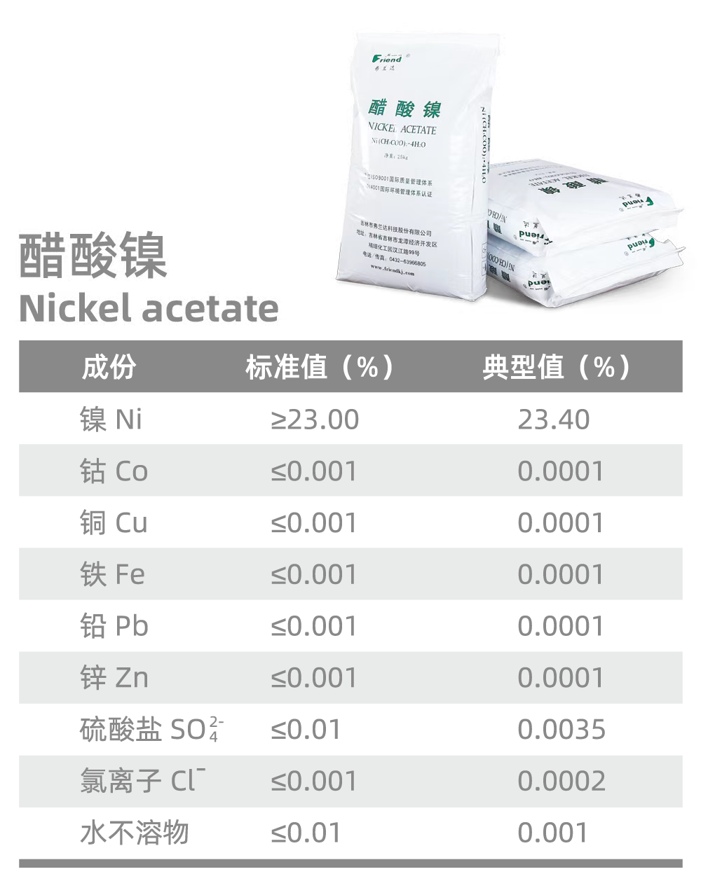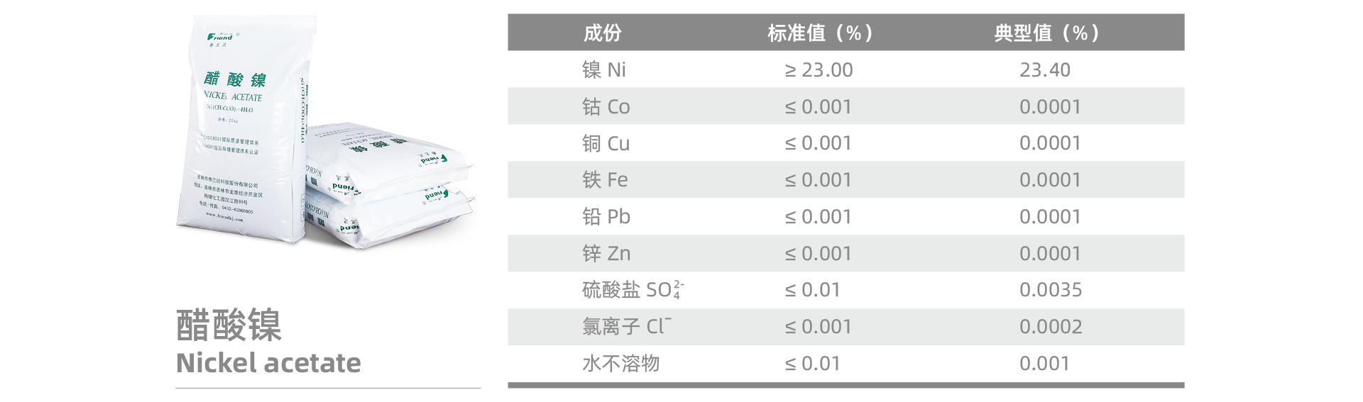 醋酸鎳(Nickel acetate) 分子式:C4H6O4Ni·4H2O 分子量:248.86 性 狀:綠色結晶性粉末,有醋酸氣味,遇水可溶解。 用 途:主要用于封孔劑、表面處理劑、電鍍、陽極氧化、金屬著色、催化劑和陶瓷色釉以及分析化學試劑等。 包 裝:塑編袋裝,每袋25公斤。 儲 運:運輸過程中,防止雨淋、受熱、受潮。不宜與酸類物品混運。貯存在通風、陰涼、干燥的庫房內,防止雨淋、受潮。不宜與酸類物品混貯。