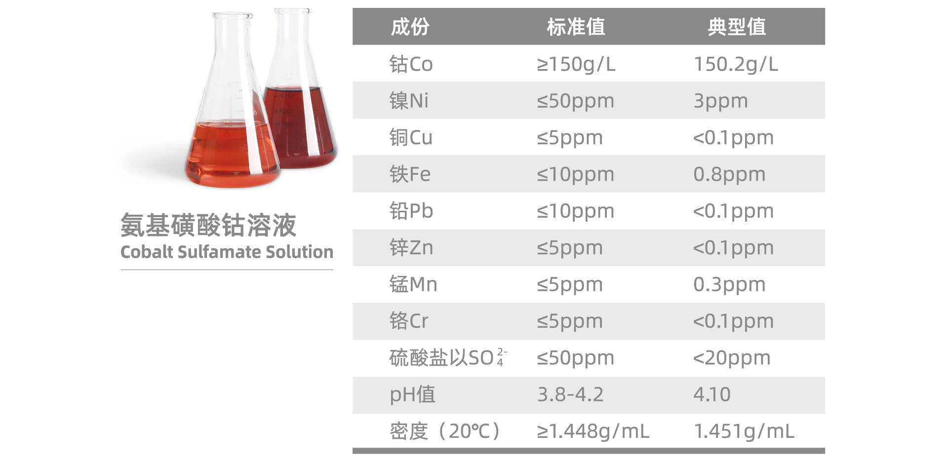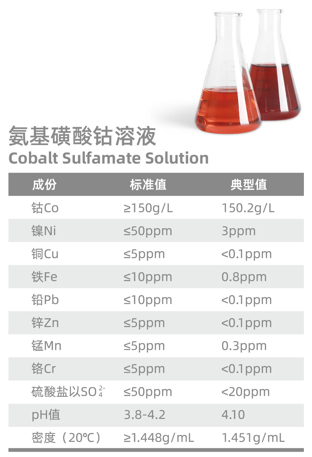 氨基磺酸鈷溶液(Cobalt Sulfamate Solution) 分 子 式:Co(NH2SO3)2 分 子 量:250.99 性 狀:紅色透明液體。 用 途:主要用于精密電鍍、電鑄、電子工業(yè)等。 包 裝:HDPE桶裝,每桶30公斤。 儲 運:運輸時包裝要密閉,運輸過程中防止受熱,貯存在陰涼,通風(fēng)處