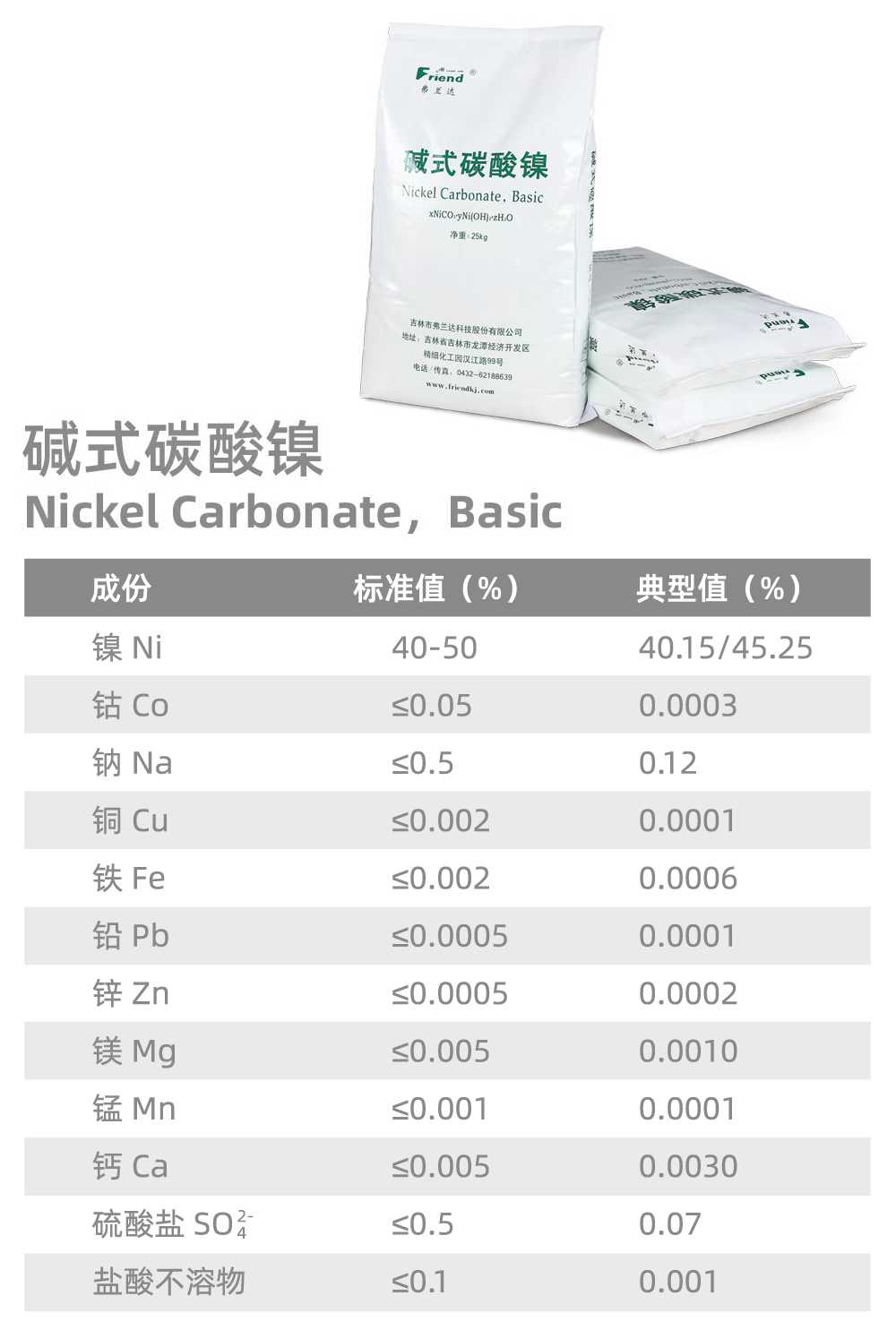 堿式碳酸鎳(Nickel Carbonate,Basic) 分子式:NiCO3 ?2Ni(OH)2 ?4H2O 分子量:376.63 性 狀:淡綠色粉末。 用 途:用于電鍍及制其他鎳鹽的原料。 包 裝:編織袋裝,每袋25公斤。 儲 運:運輸過程中,防止雨淋,受熱,受潮。嚴禁與酸類物品混運。貯存在通風、陰涼、干燥的庫房內(nèi),防止雨淋、受潮。嚴禁與酸類物品混貯。